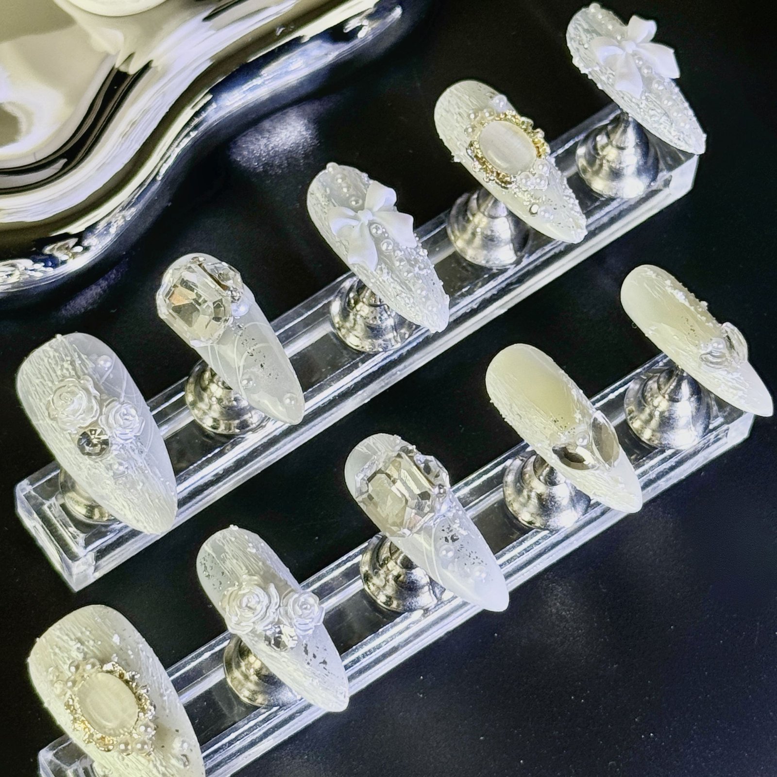 The nails are decorated with 3D bows, roses, pearls, and diamond designs, adding a touch of garden atmosphere and ambiance